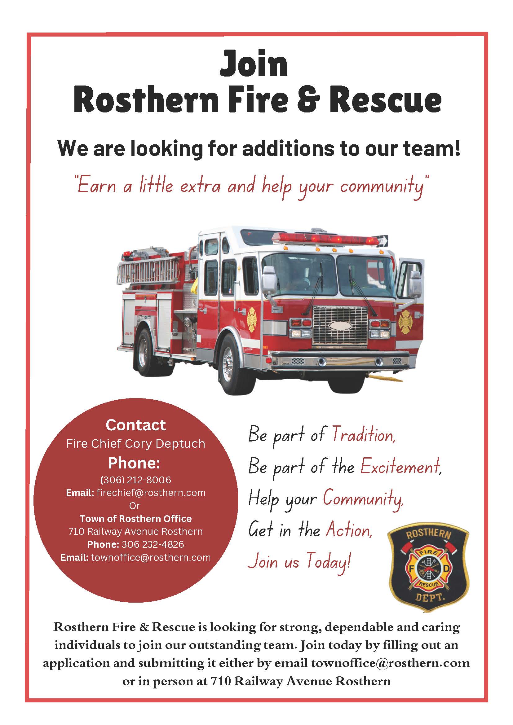 Together with the RM of Rosthern No. 403 the Rosthern Fire & Rescue provides emergency services for the RM and Town of Rosthern and surrounding areas. The Fire & Rescue team is comprised of one (1) Fire Chief and 12 Volunteer members who are ready to respond to any emergency that arises. If you are interested in joining our outstanding team please click the link to view the application: