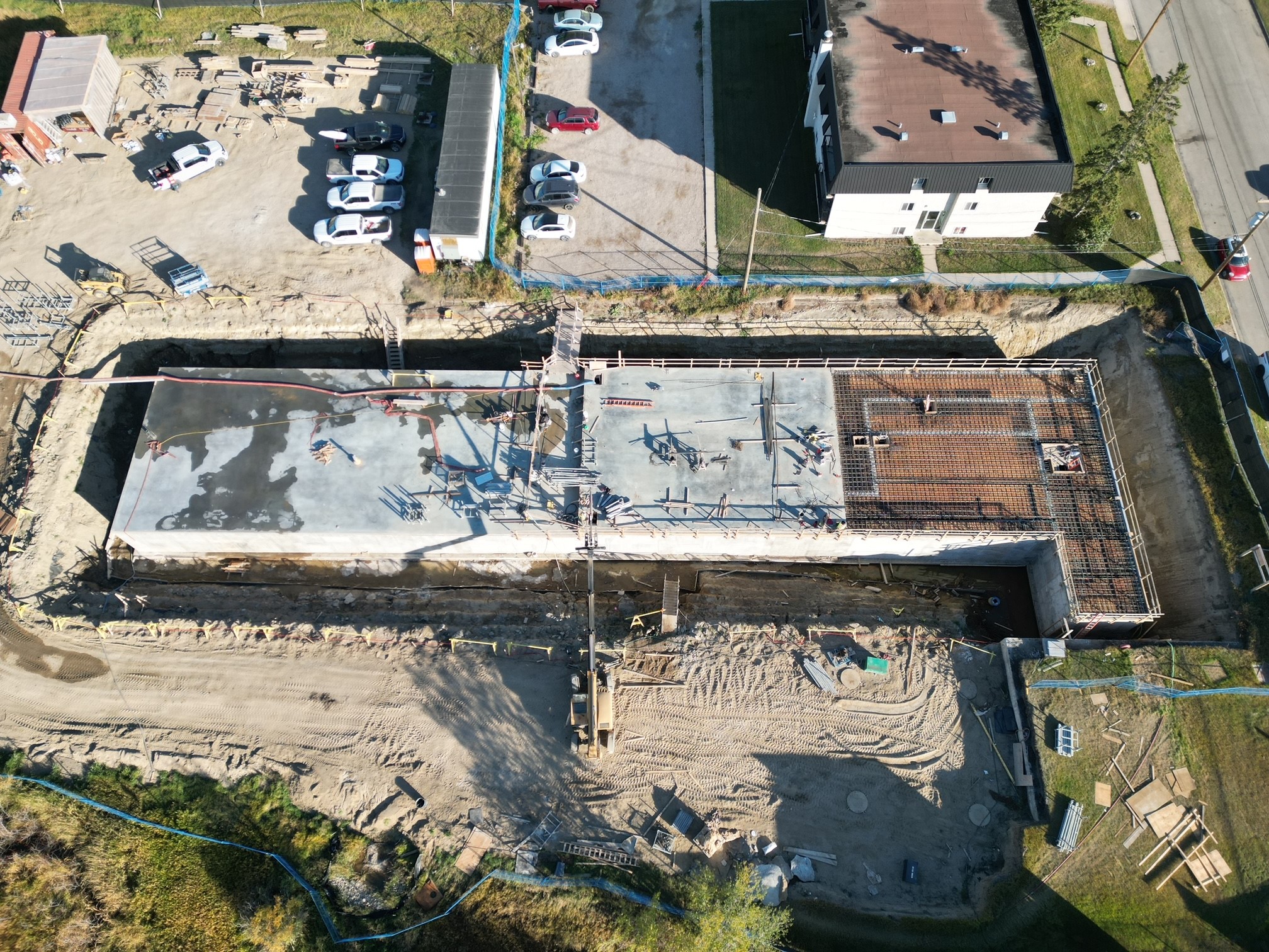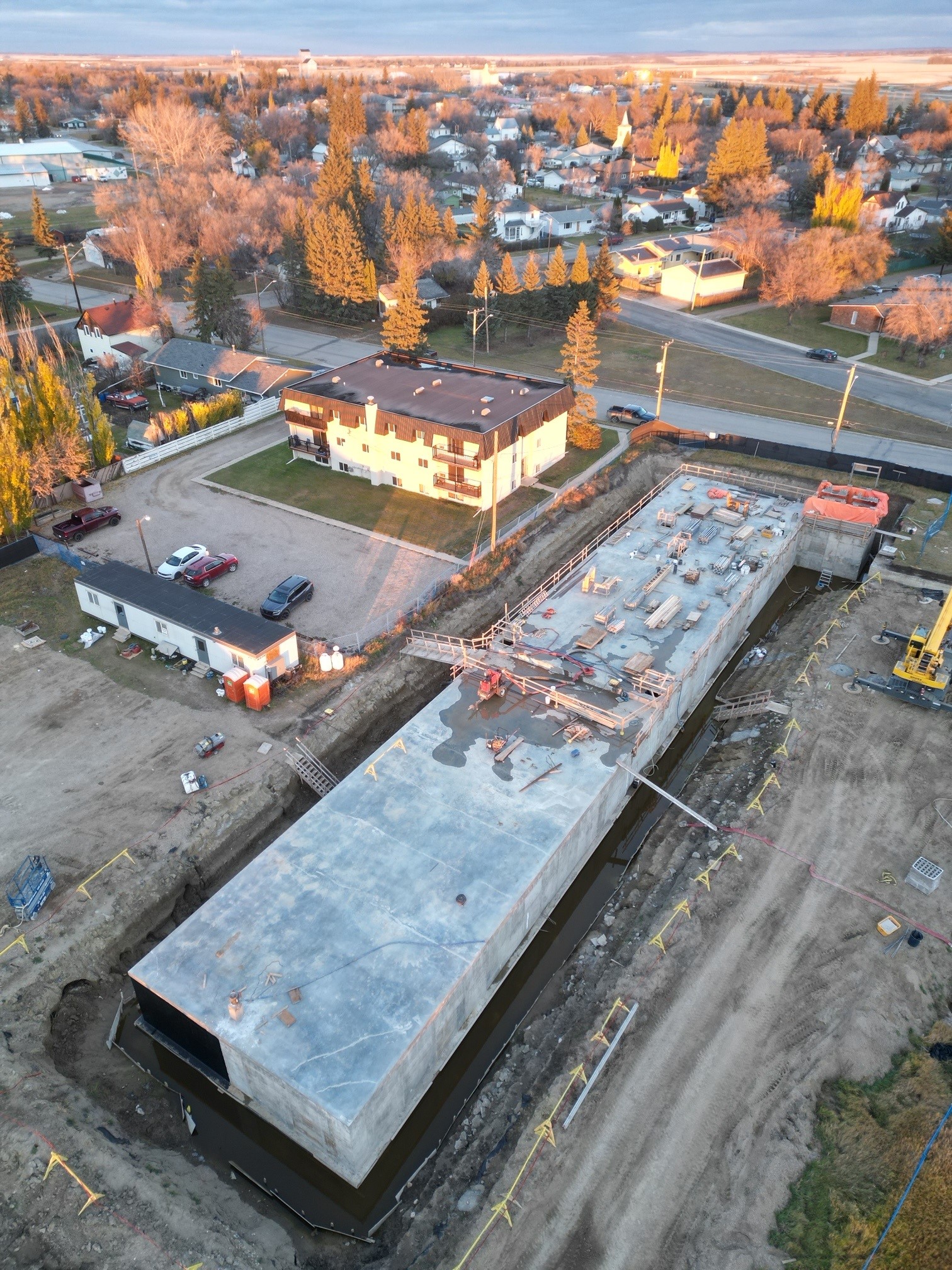 Rosthern’s new Water Treatment Plant continues to move forward with steady momentum. Currently underway is the construction of a below-grade, multi-chamber concrete reservoir beneath the facility. This structure will store treated water while also forming the foundation for the Water Treatment Plant itself.